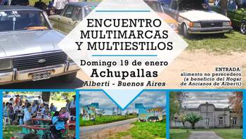 Este domingo 19 de enero en Achupallas, partido de Alberti, se realiza desde horas de la mañana un encuentro multimarcas y multiestilos organizado por la “Asociación Amigos de Achupallas”. Se invita a concurrir a todo aquel que guste de los encuentros de autos y de pasar el día en una comunidad rural, “Pueblos de Amigos” en este caso, como lo es Achupallas. La exposición se hará en las calles que rodean a la Plaza 25 de Mayo, frente al predio con complejo de parrillas.