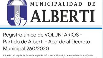 Mediante el decreto 260/20 el intendente de Alberti, Germán Lago, dispuso la creación del registro de voluntarios en el distrito para para la atención de la emergencia sanitaria que atravesamos y con el fin de canalizar todas las voluntades de los vecinos y vecinas "que nos expresaran su compromiso para colaborar y acompañarnos entre todos en esta situación", se indicó en los fundamentos.