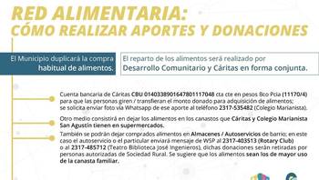 Por su parte, en Nueve de julio el municipio publicó un nro de CBU para recibir donaciones. Además, se habilitó la compra de alimentos en almacenes y autoservicios de barrio, donde se dejarán los alimentos comprados. También se puede dejar alimentos que Cáritas y Colegio Marianista San Agustín tienen en supermercados.