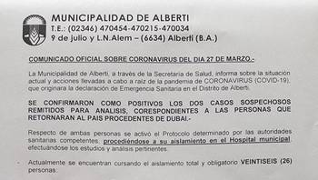 Este viernes se confirmaron dos casos positivos de Coronavirus en Alberti. Se trata de dos mujeres que retornaron al país procedentes de Dubai.