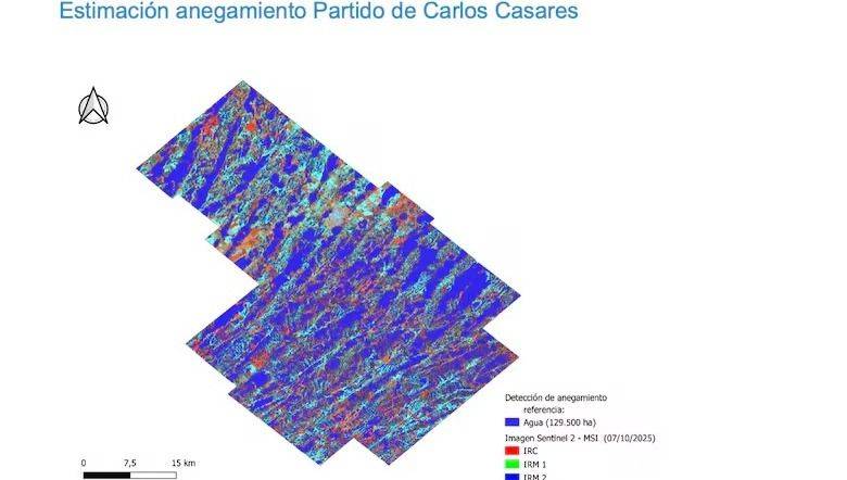 El relevamiento forma parte de un trabajo que incluyó también a los partidos de 9 de Julio y Bragado, donde las superficies afectadas fueron del 42,1% y del 23,1%, respectivamente. Sin embargo, el caso de Carlos Casares resulta el más severo, ya que proporcionalmente presenta el mayor porcentaje de tierras bajo agua en toda la región.