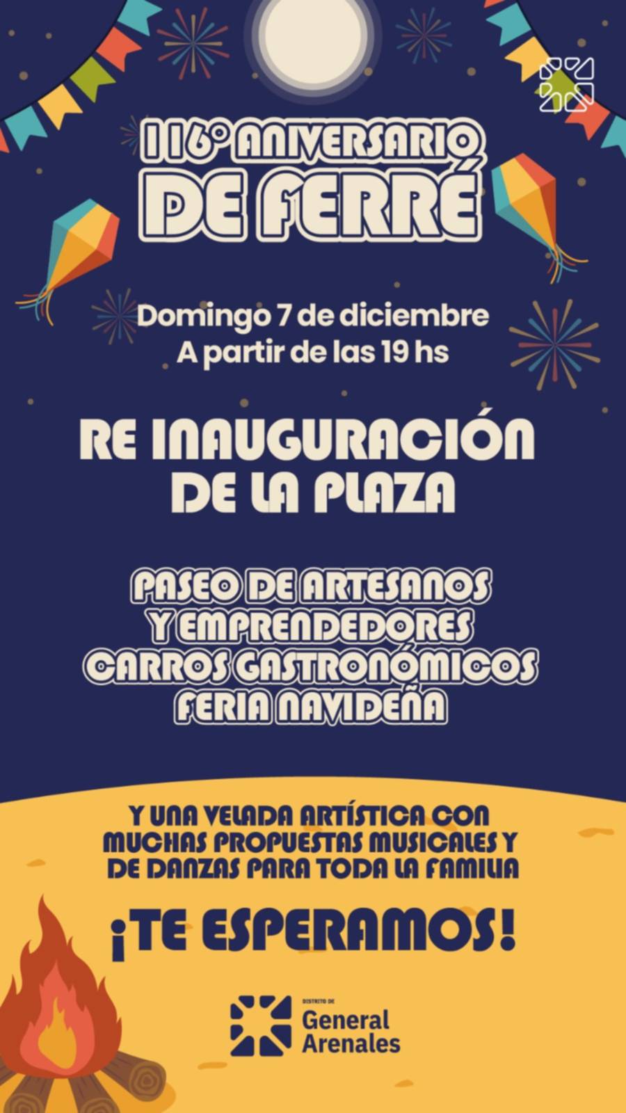 La localidad de Ferré celebrará su 116° aniversario el próximo domingo 7 de diciembre, a partir de las 19 horas, con un evento central que incluirá la reinauguración de la plaza principal y una amplia propuesta cultural, gastronómica y artesanal para toda la comunidad.