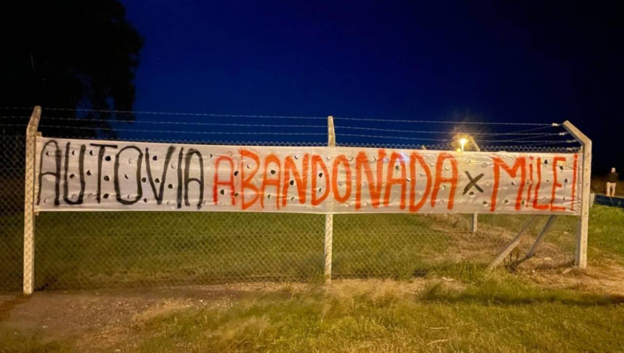 En las últimas horas, aparecieron pasacalles con críticas al presidente Javier Milei sobre la Ruta Nacional 7, a la altura de Chacabuco, en reclamo por el abandono de la obra de la Autovía.